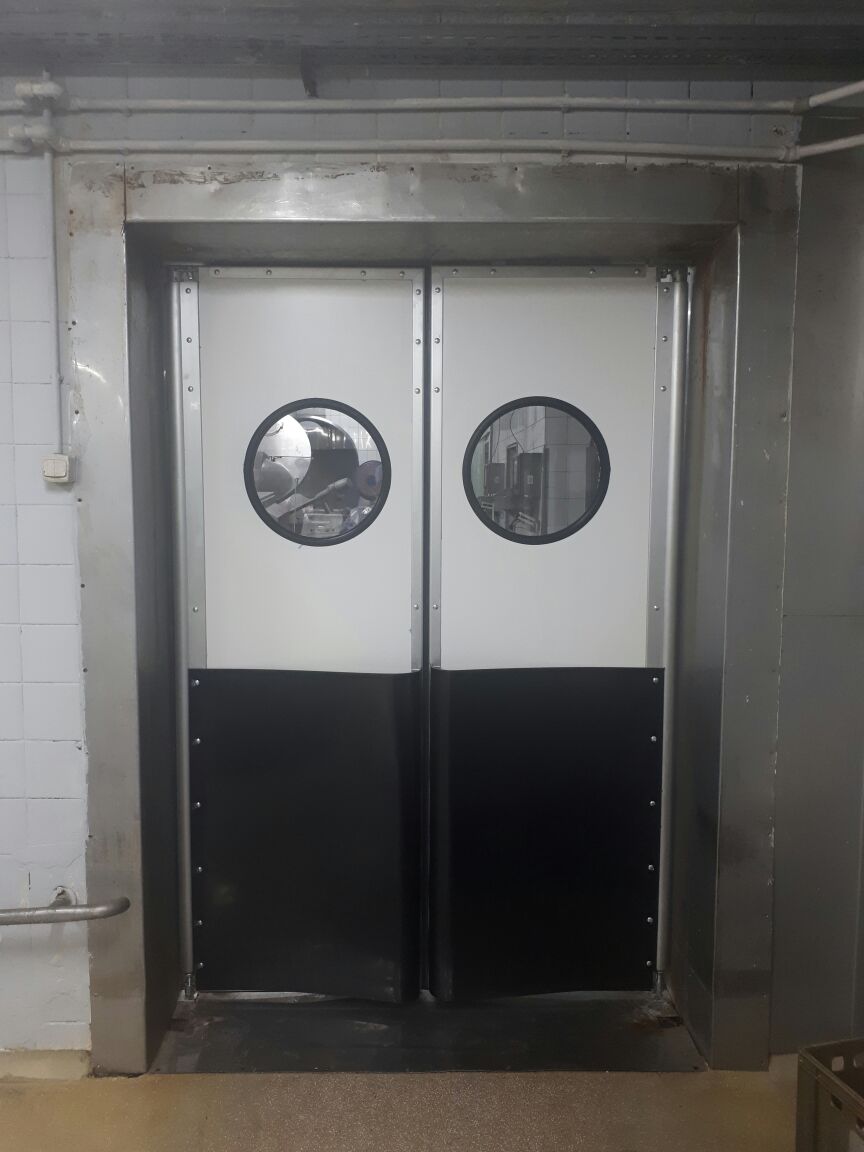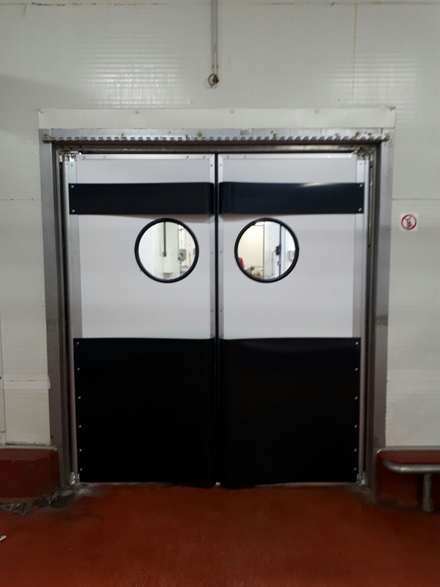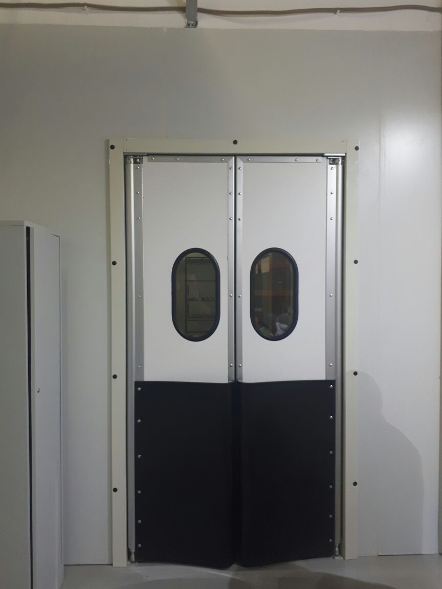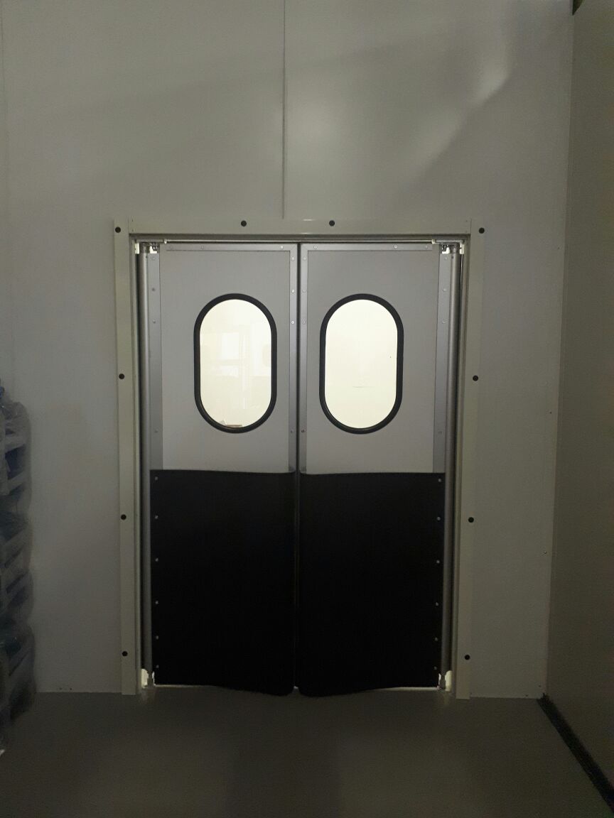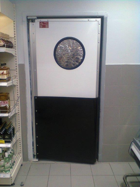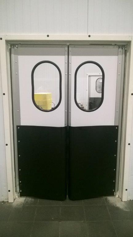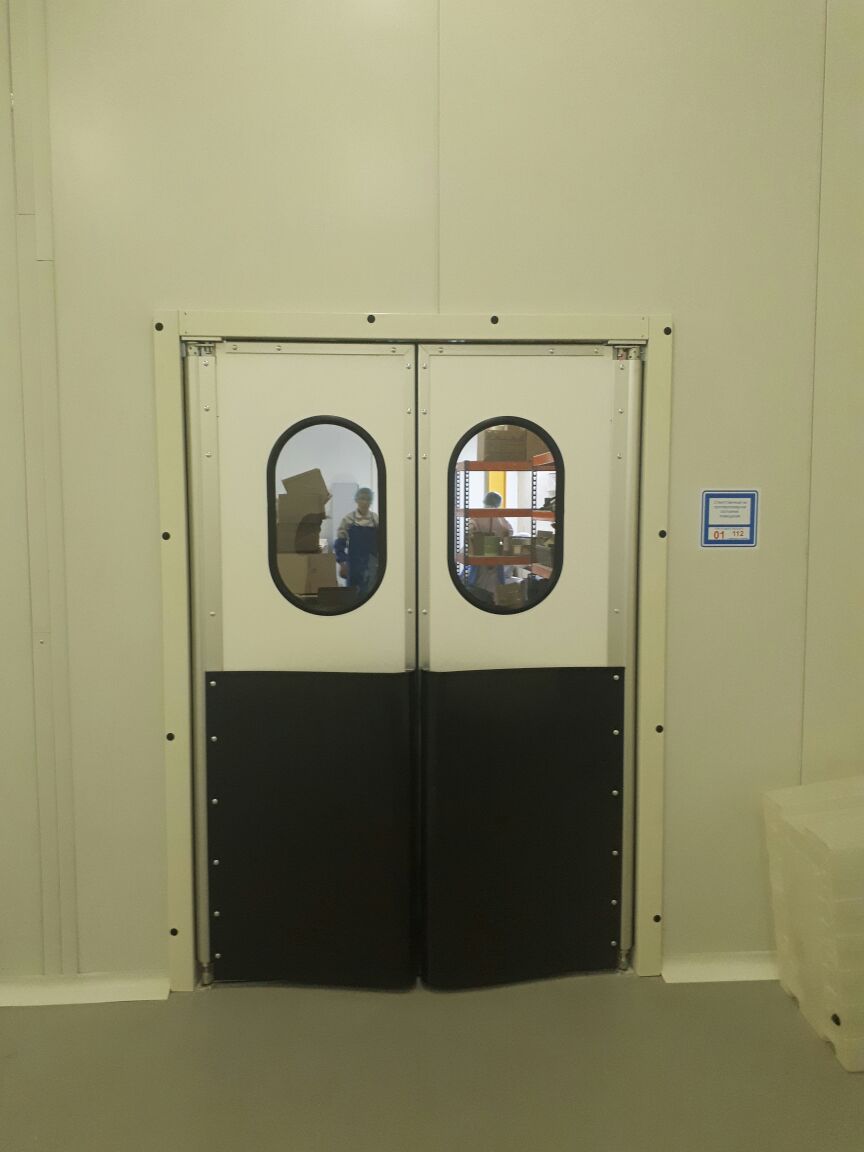 Створка двери выполняется из высококачественных сэндвич-панелей толщиной 24 мм, которые характеризуются низкой теплопроводностью, высокой влагопроницаемостью, малым весом, оптимальной прочностью на сдвиг и растяжение, высоким пределом на сжатие. Внешние поверхности панели изготовлены из твёрдого ударопрочного поливинилхлорида, внутренний слой – прессованный полистироловый пенопласт RTM. В каркасе дверных створок предусмотрено эластичное силиконовое уплотнение, которое эффективно ограничивает проток воздуха между каркасом и косяком двери. В нижней части створок предусмотрены отбойные листы специальной формы, изготовленные из твёрдого полиэтилена, которые защищают створки дверей от ударов (штабелеры, тележки и т.д.). В дверных створках предусмотрены окна круглой формы, выполненные из прозрачного поликарбоната.
