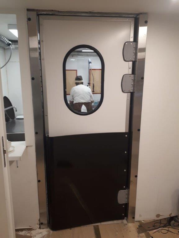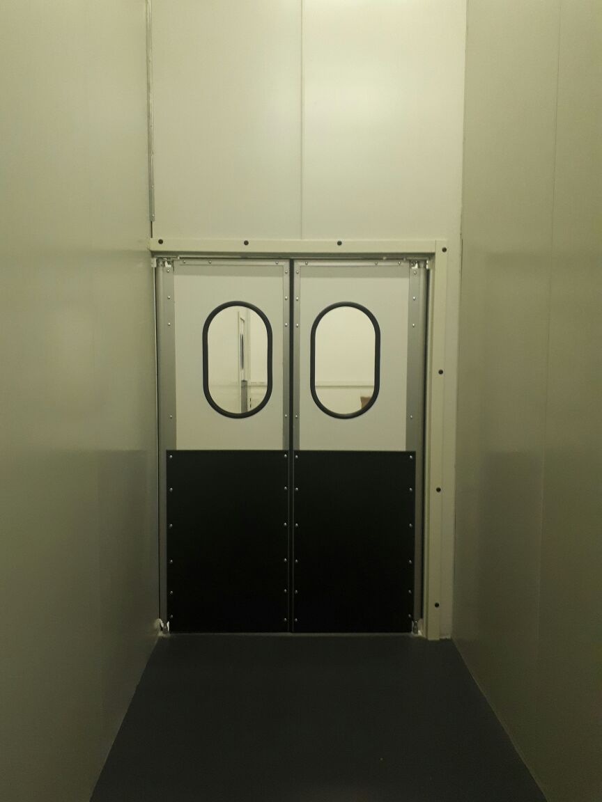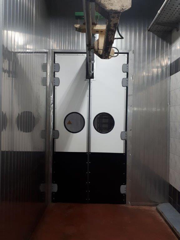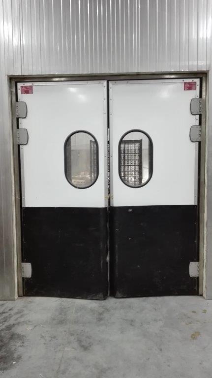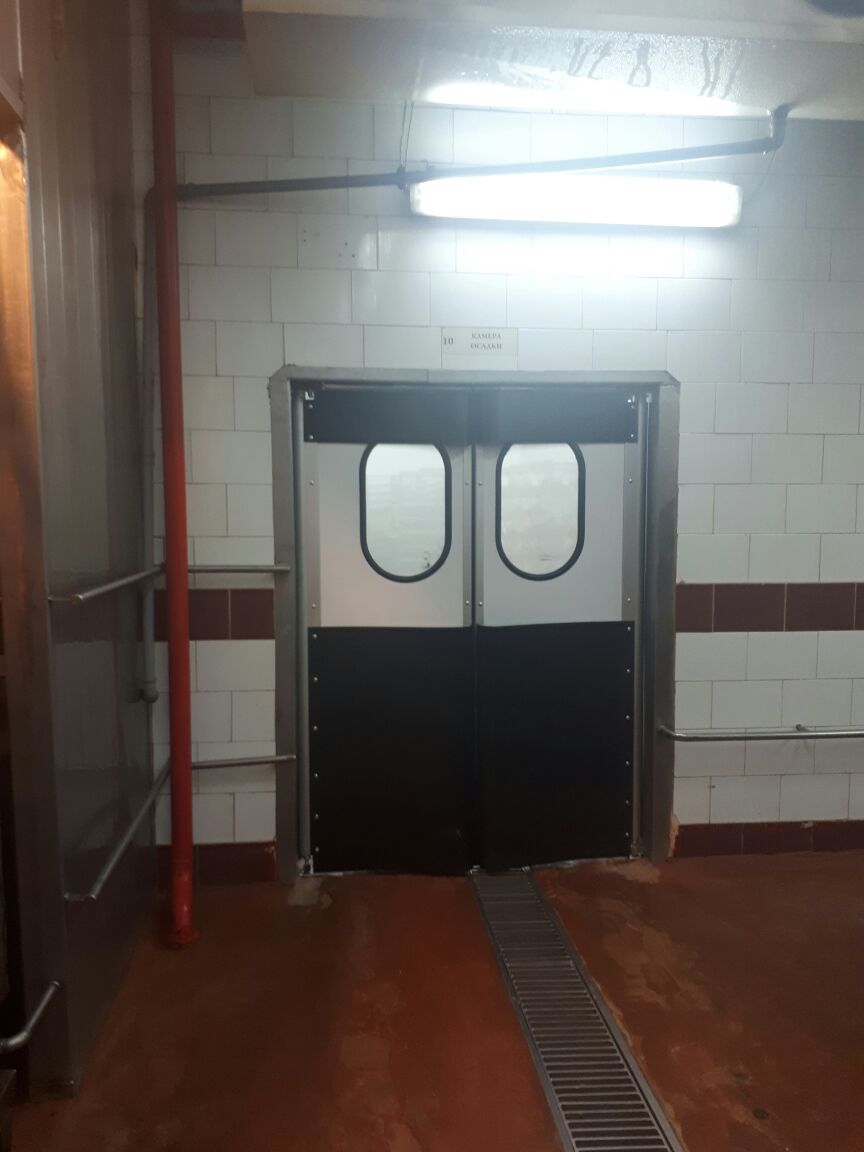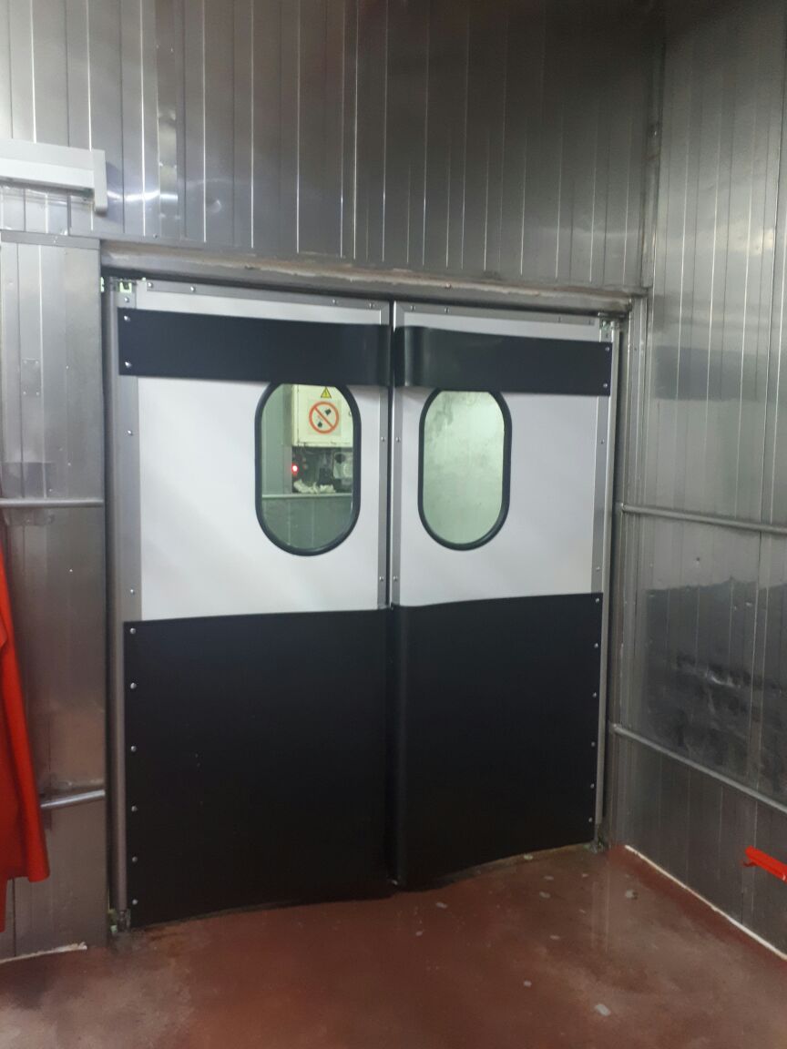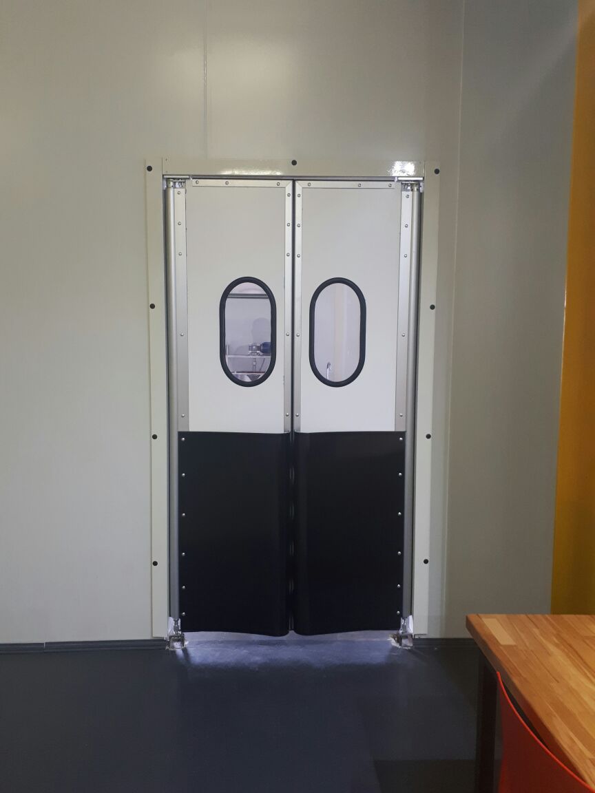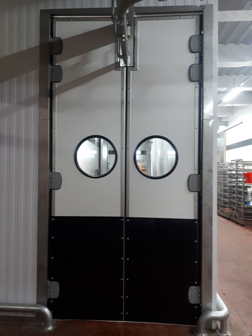 Створка двери выполняется из высококачественных сэндвич-панелей толщиной 24 мм, которые характеризуются низкой теплопроводностью, высокой влагопроницаемостью, малым весом, оптимальной прочностью на сдвиг и растяжение, высоким пределом на сжатие. Внешние поверхности панели изготовлены из твёрдого ударопрочного поливинилхлорида, внутренний слой – прессованный полистироловый пенопласт RTM. В каркасе дверных створок предусмотрено эластичное силиконовое уплотнение, которое эффективно ограничивает проток воздуха между каркасом и косяком двери. В нижней части створок предусмотрены отбойные листы специальной формы, изготовленные из твёрдого полиэтилена, которые защищают створки дверей от ударов (штабелеры, тележки и т.д.). В дверных створках предусмотрены окна круглой формы, выполненные из прозрачного поликарбоната.