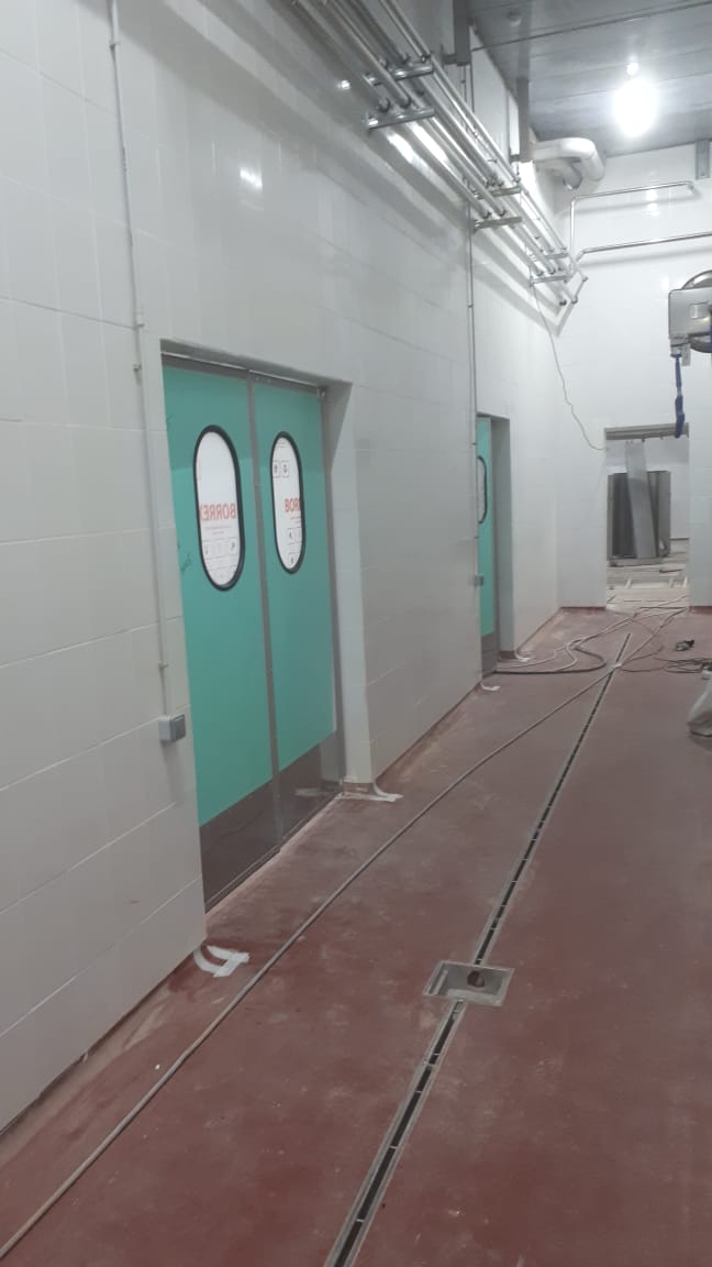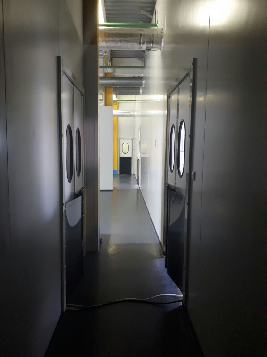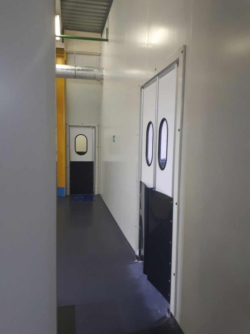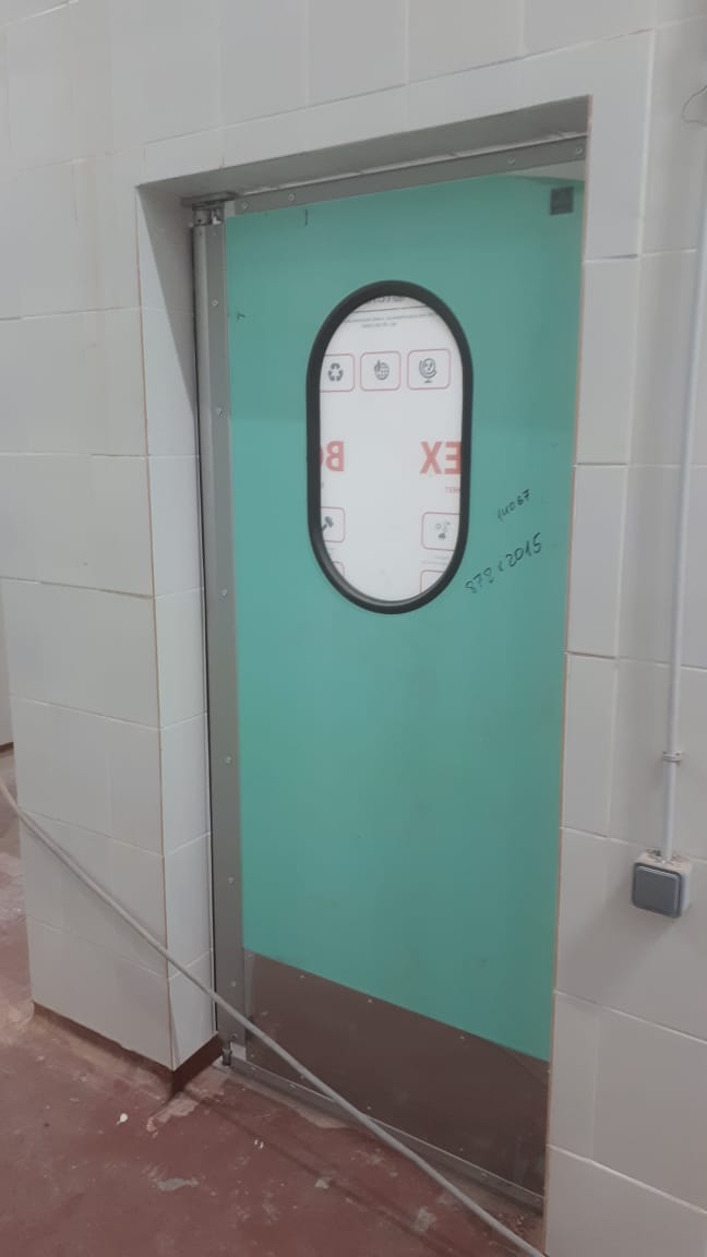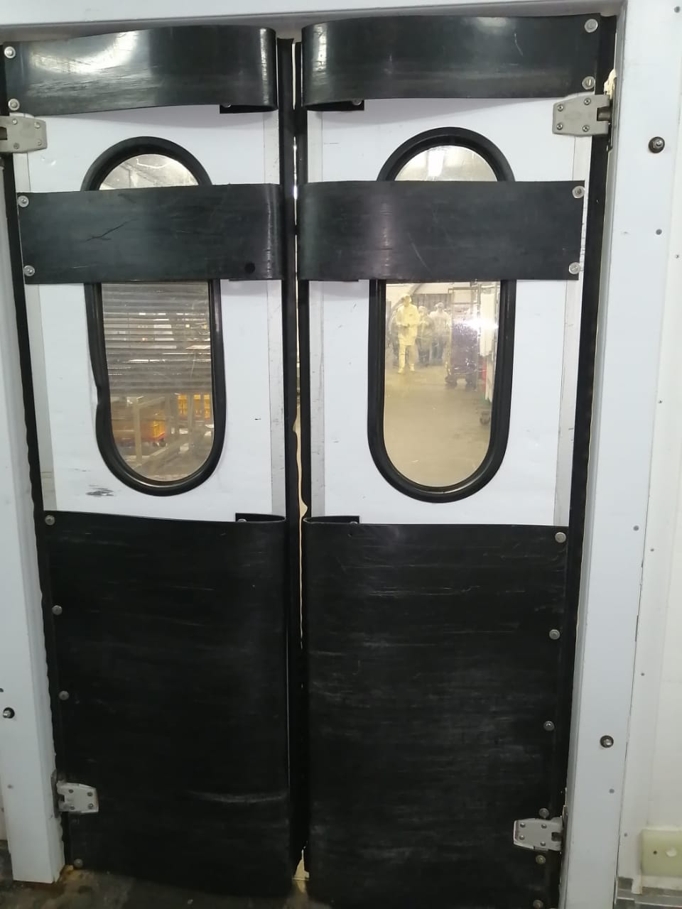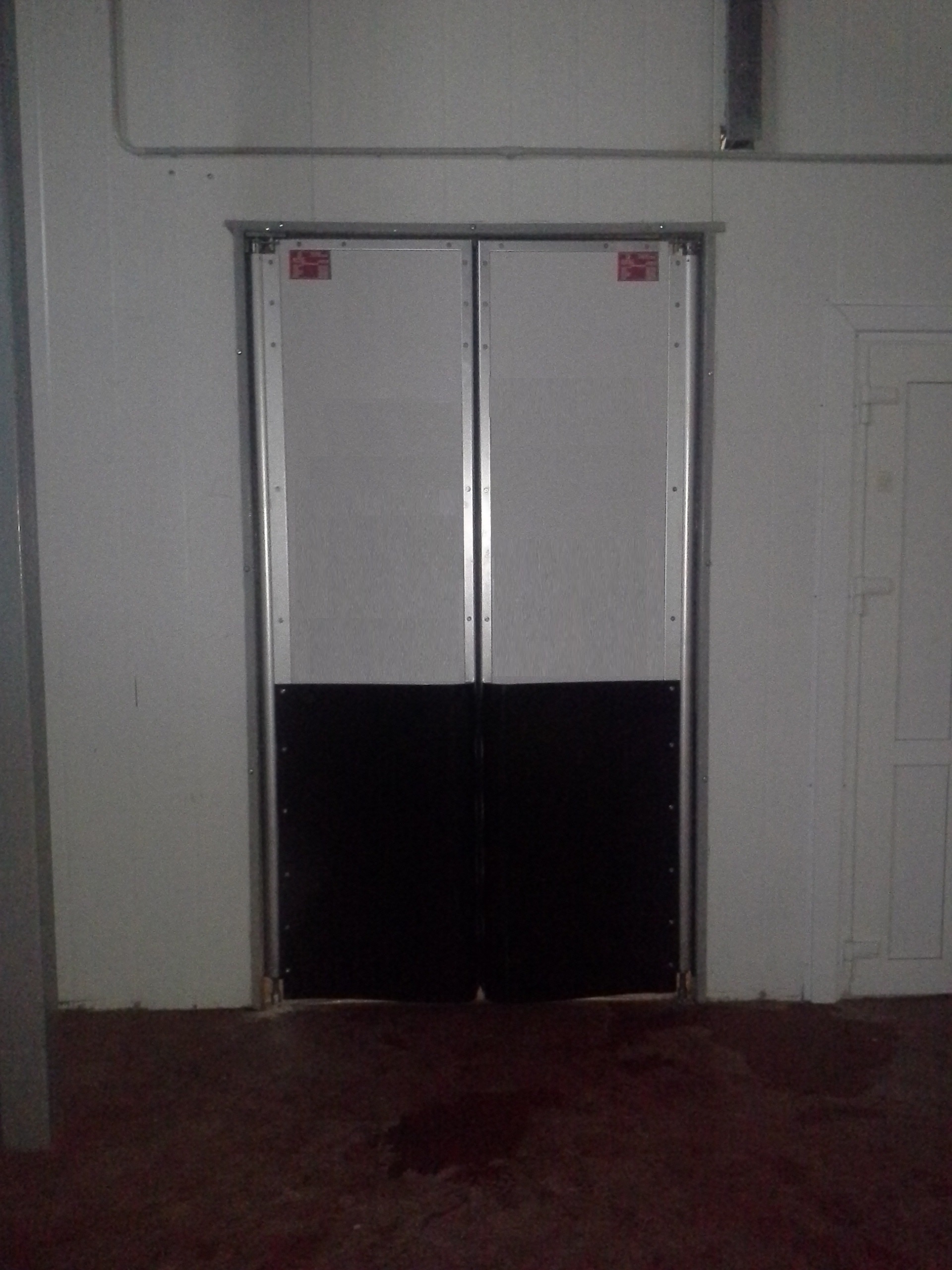 Створка двери выполняется из высококачественных сэндвич-панелей толщиной 24 мм, которые характеризуются низкой теплопроводностью, высокой влагопроницаемостью, малым весом, оптимальной прочностью на сдвиг и растяжение, высоким пределом на сжатие. Внешние поверхности панели изготовлены из твёрдого ударопрочного поливинилхлорида, внутренний слой – прессованный полистироловый пенопласт RTM. В каркасе дверных створок предусмотрено эластичное силиконовое уплотнение, которое эффективно ограничивает проток воздуха между каркасом и косяком двери. В нижней части створок предусмотрены отбойные листы специальной формы, изготовленные из твёрдого полиэтилена, которые защищают створки дверей от ударов (штабелеры, тележки и т.д.). В дверных створках предусмотрены окна круглой формы, выполненные из прозрачного поликарбоната.
